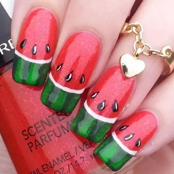2. 在美甲图案中加入一些与吃瓜相关的元素,如瓜皮、瓜籽等。